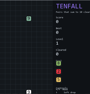 **TENFALL** is a clean, fast, and fully self-contained Python/Pygame puzzler built for the theme *Numbers*.